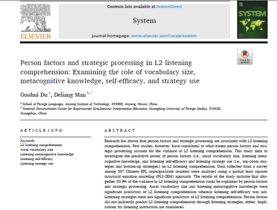 近日,公司太阳成集团tyc122cc教师杜国辉(马来亚大学博士,河南科技公司硕士生导师)以第一作者身份在SSCI中科院一区语言学期刊《System》发表1篇学术论文,论文题目为《Person factors and strategic processing in L2 listening comprehension: Examining the role of vocabulary size, metacognitive knowledge, self-efficacy, and strategy use》。