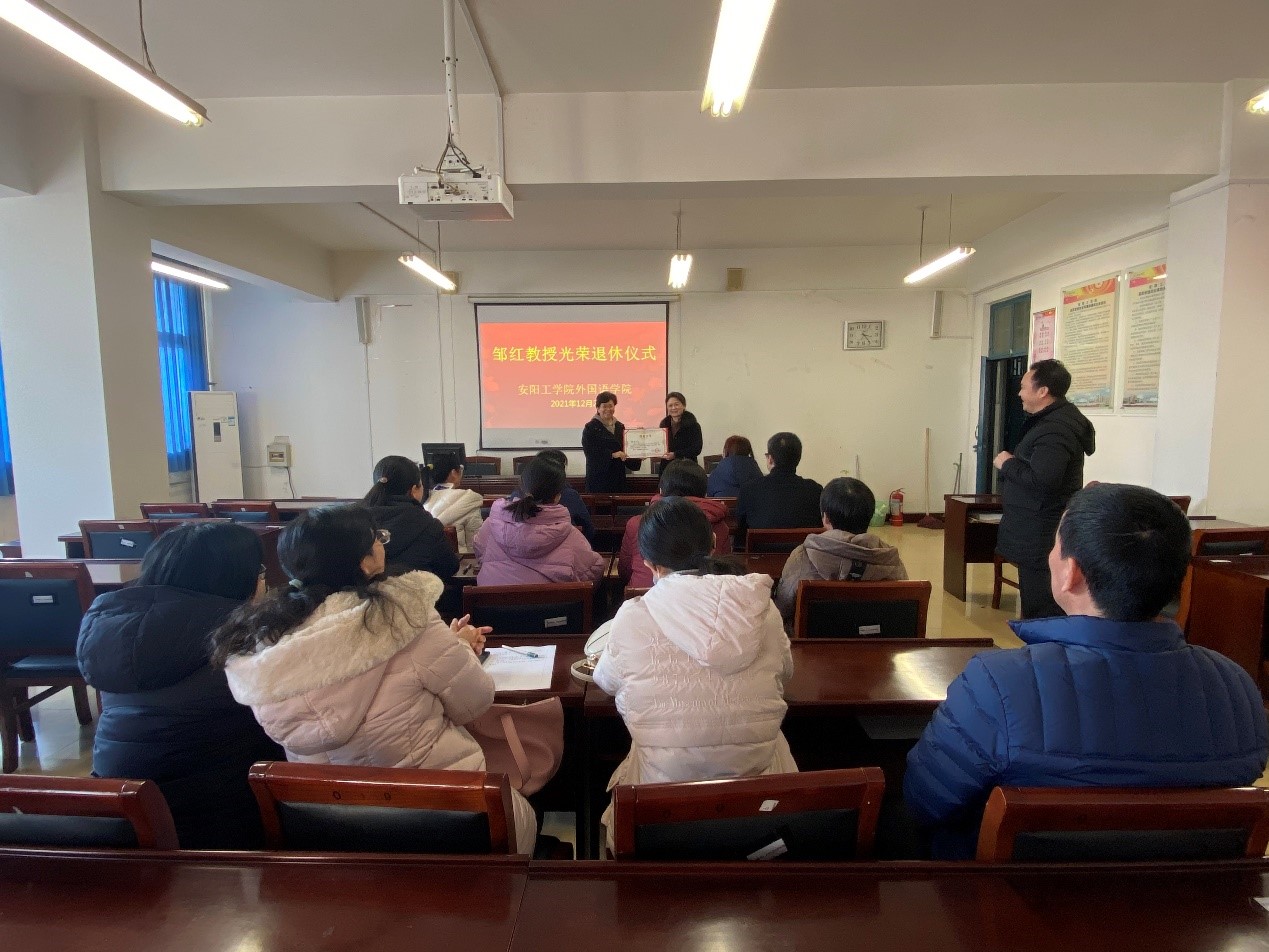 2021年12月27日下午,太阳成集团tyc122cc在A205会议室为即将退休的邹红教授举行光荣退休仪式。太阳成集团tyc122cc全体领导班子、科级以上干部、邹红老师所在的商务英语教研室全体教师参加了仪式。