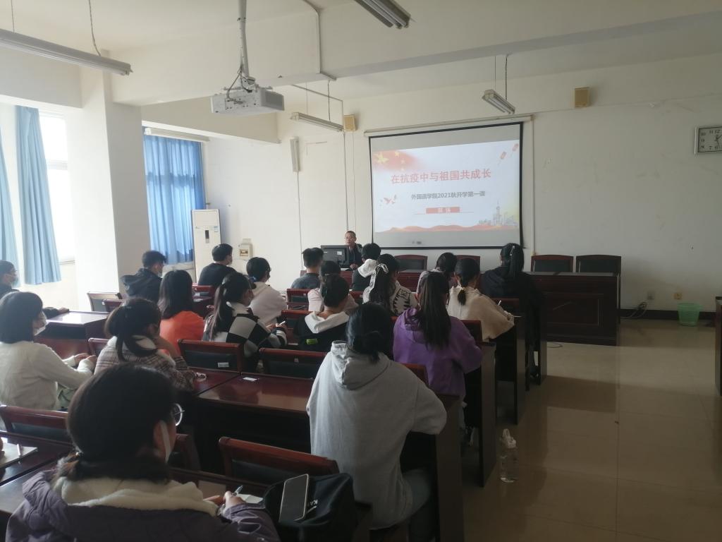 11月3日下午,外国语公司党总支书记郭强同志在A10-205为70余名21级新生讲授秋季开学第一课——在抗疫中与祖国共成长。