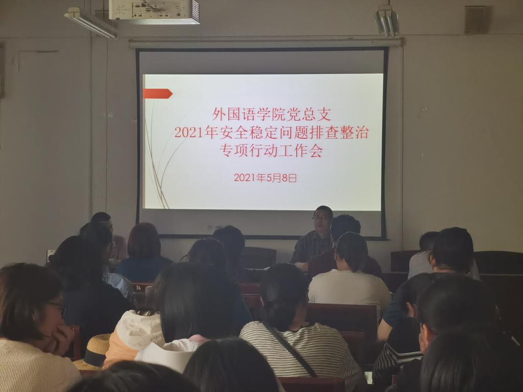 5月8日下午,外国语公司党总支在A10-205召开2021年安全稳定问题排查整治专项活动工作会。公司班子成员及全体教工参加会议。