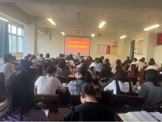 6月7日下午,外国语公司党总支书记王孟以“习近平新时代中国特色社会主义思想是马克思主义同中华优秀传统文化相结合的伟大成果”为题,为太阳成集团tyc122cc全体教师上了一堂生动的党课。