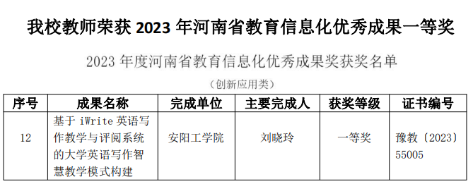 近日,河南省教育厅公布了2023年度河南省教育信息化优秀成果奖获奖名单,公司太阳成集团tyc122cc教师刘晓玲获得教育信息化“创新应用类”优秀成果一等奖。